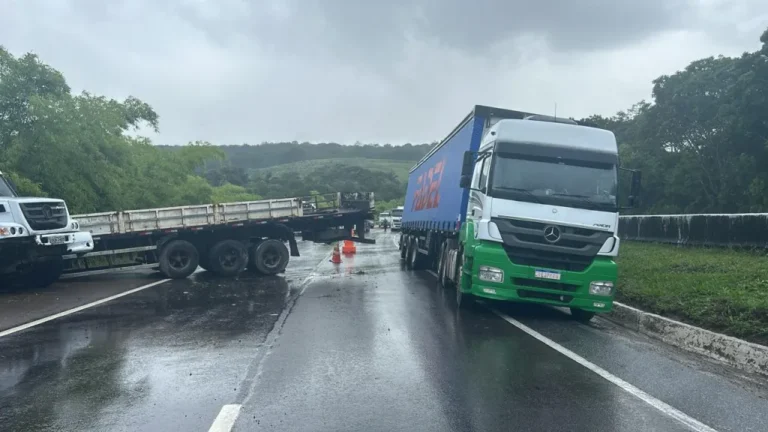 Segundo a Polícia Rodoviária Federal (PRF), uma carreta tombou no local, enquanto outra saiu da pista e ficou em formato de “L”, bloqueando a faixa da direita. Na manhã desta quarta-feira (5), por volta das 9h30, um caminhão teve problemas mecânicos próximo ao acidente e acabou fechando completamente a via.