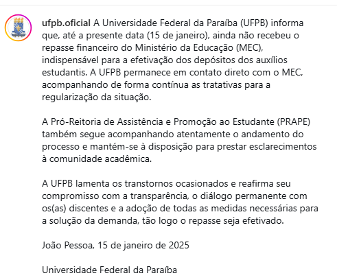 A UFPB lamentou os transtornos causados aos estudantes e destacou que tomará as providências necessárias assim que o repasse for liberado, reafirmando o compromisso com a transparência e o diálogo com a comunidade acadêmica.